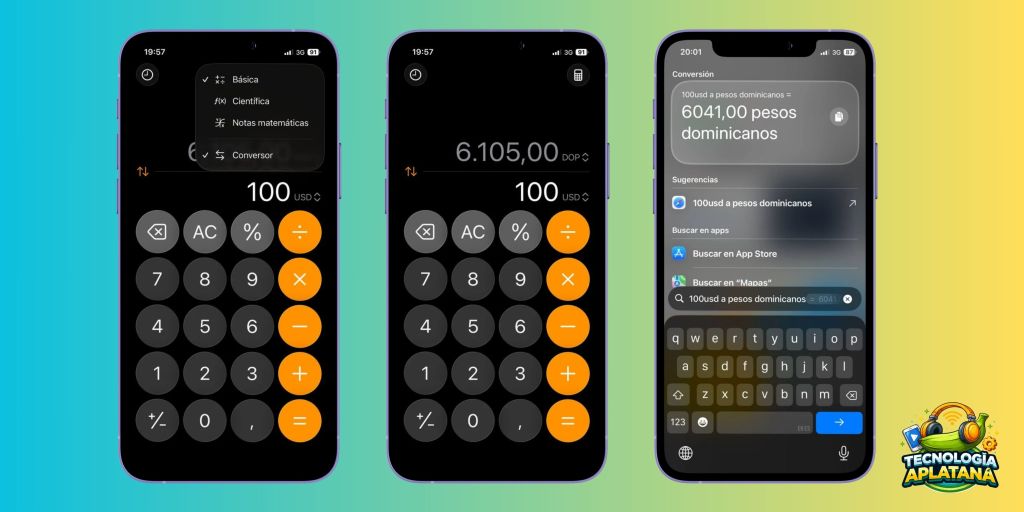 Desde hace varias actualizaciones de iOS, la Calculadora del iPhone incluye un sistema de conversión integrado. Esto significa que puedes cambiar de dólares a pesos dominicanos, de grados Celsius a Fahrenheit o de libras a kilogramos sin salir de la app.